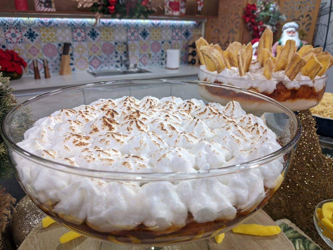 Separe uma taça ou uma travessa de vidro, coloque a banana caramelada, faça uma camada com o creme e por último com a manga de confeitar faça picos com o merengue suíço. Se preferir pode usar o maçarico para dourar. Leve para gelar por cerca de uma hora. Sirva gelado.