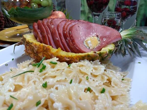 4. Em seguida retire do forno, desembrulhe do papel alumínio, coe o molho e reserve o mesmo. Quando amornar o tender fatie e sirva dentro do abacaxi, derrame o molho reservado por cima e sirva com a massa.