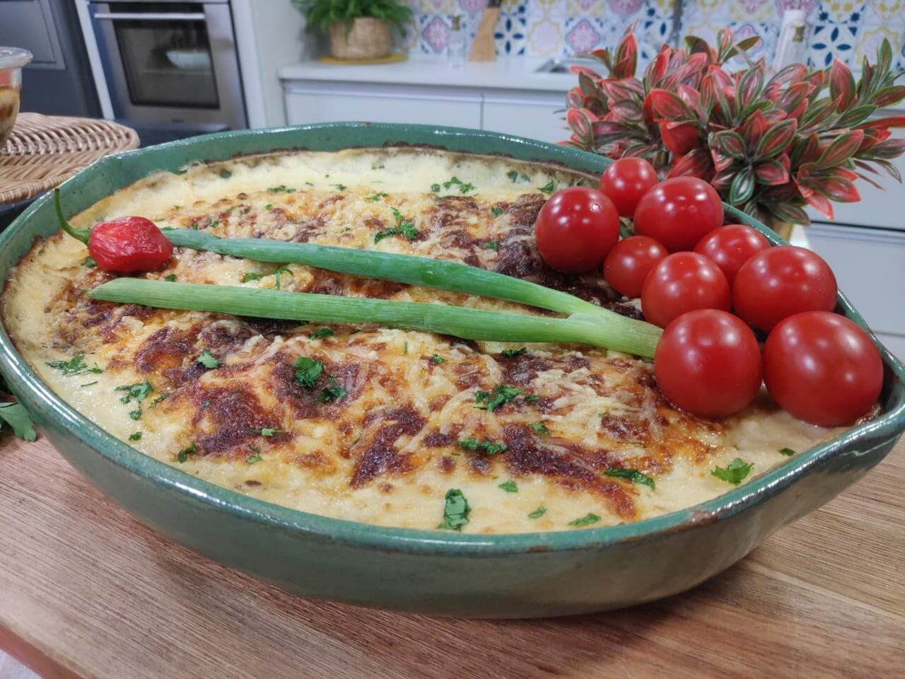 Camada de filé de peixe frito, molho bechamel, queijos e leve ao forno. Quando retirar, decore com o cheiro verde picado e sirva com o arroz de couve-flor.