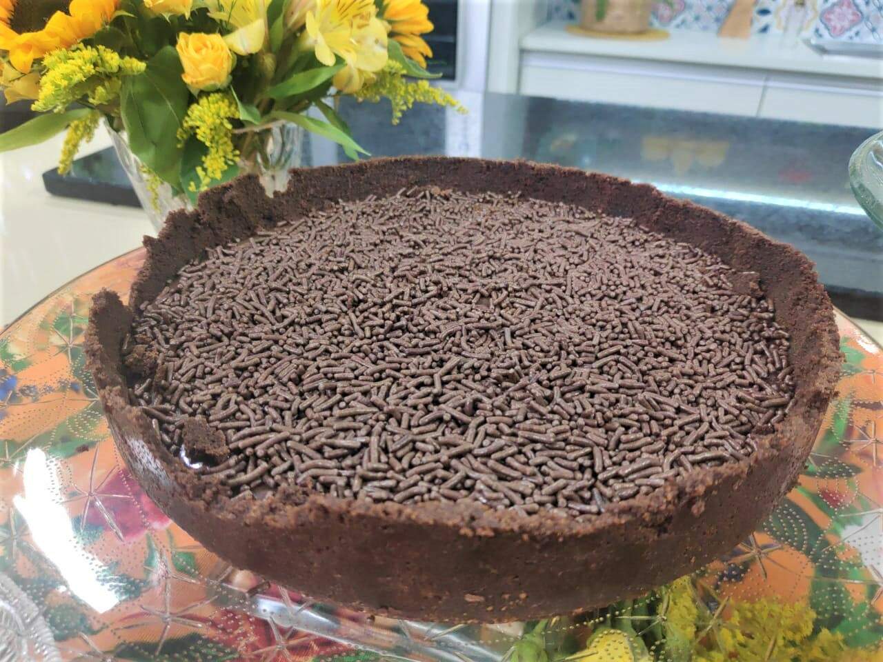 Em primeiro lugar, faça uma farofa de bolacha de chocolate: triture no liquidificador 1 pacote de bolacha amanteigada de chocolate em ponto de areia grossa. Depois, coloque a farofa de bolacha de chocolate em uma tigela e junte 1 xícara (chá) de manteiga sem sal derretida no micro (em potência alta) por 1 minuto. Agora misture até obter uma farofa grossa e úmida, como areia molhada. Por fim espalhe a massa no fundo e nas laterais da forma 23-24 cm, com fundo removível. Depois amasse, unindo as partes da massa com auxílio da colher ou com a ponta dos dedos. Lembre-se de que massa não vai ao forno e não precisa assar. Por último reserve-a já enformada, dentro da geladeira, enquanto você prepara o recheio de brigadeiro.