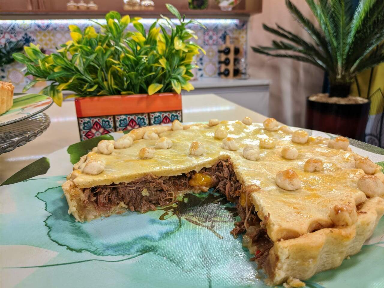 Misture a farinha, o sal e a manteiga com a ponta dos dedos até obter uma farofa. Adicione o leite aos poucos e amasse rapidamente até homogeneizar. Molde uma bola, embrulhe em filme plástico e leve à geladeira por 20 minutos ou até firmar ligeiramente. Abra cerca de 2/3 da massa com o rolo e forre uma fôrma de fundo removível (22 cm de diâmetro). Distribua o recheio e cubra com o restante da massa, vedando bem a borda. Se desejar, corte um quadrado no centro da massa para a saída de vapor. Pincele com a gema e asse em forno médio preaquecido (200°C) por cerca de 40 minutos ou até dourar. Aguarde uns 15 minutos para desenformar.