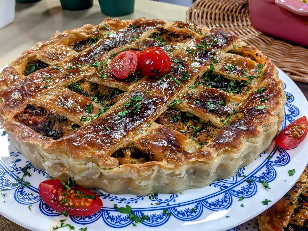 Levar ao forno para pré-assar (assim vamos evitar dela ficar crua) por aproximadamente 10min. Dispor o lombo já frio por toda superfície e colocar as cebolas caramelizadas por cima, fechar a torta com outra camada de massa folhada, pincelar azeite e orégano por cima. Levar para assar no forno a 180 graus até dourar.