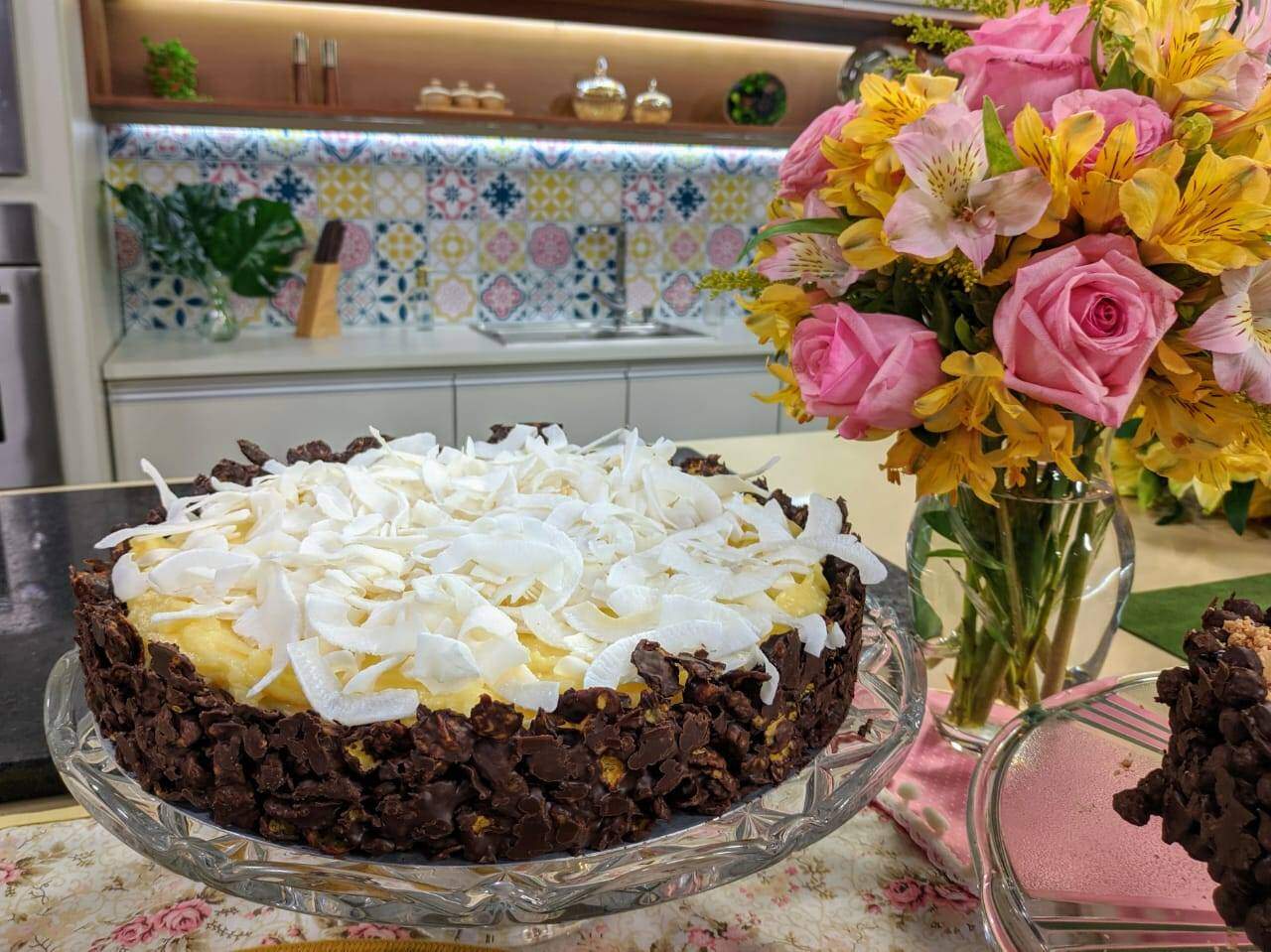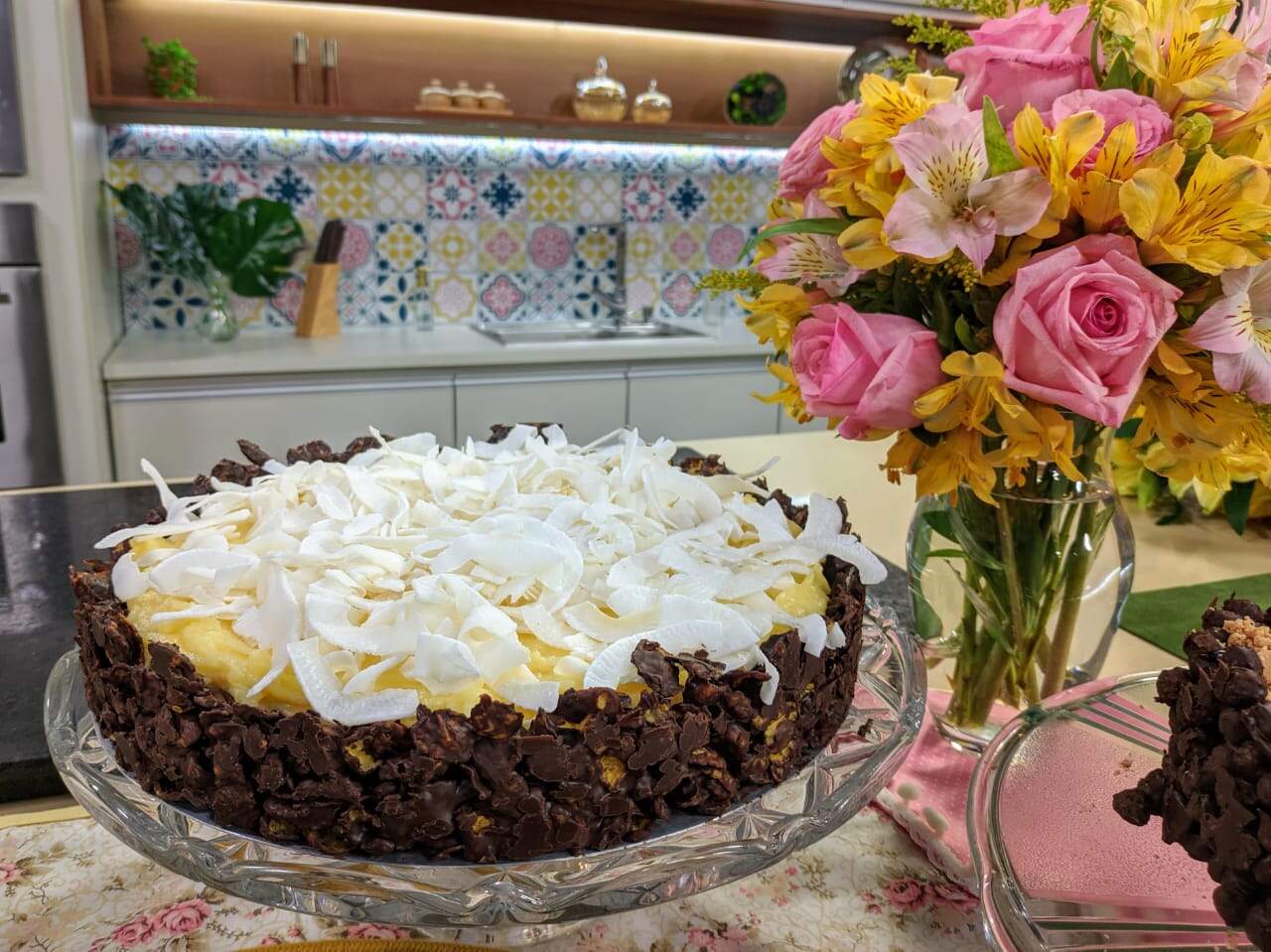 Modo de preparo do recheio: Misture o leite condensado, os flocos de coco e as gemas. Leve ao fogo baixo até que a massa solte do fundo da panela. Deixe esfriar e coloque o creme de leite sem soro. Se quiser esfriar na geladeira, cubra com filme sobre a mistura, não deixando espaço para criar água. Recheie a torta e cubra com mais coco ou chocolate ralado e sirva gelada.