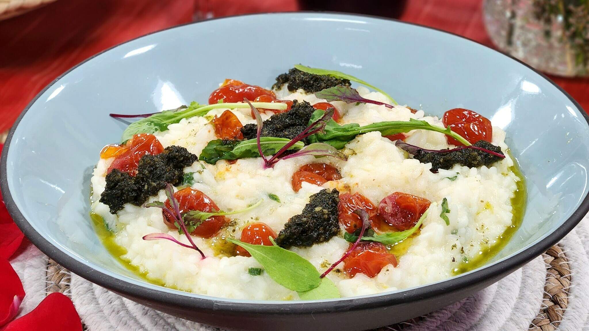 Acrescente mais uma parte do caldo de legumes, e vá repetindo o processo até o arroz ficar cremoso e al dente. Desligue o fogo, coloque os queijos, o restante da manteiga, ajuste o sal e a pimenta e finalize com molho pesto, o tomate cereja confitado e a rúcula.