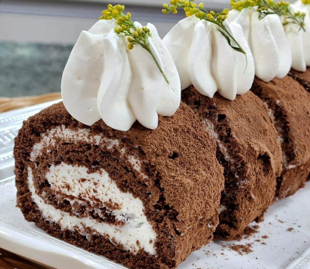 Coloque o recheio sobre o bolo, enrole como um rocambole com o auxílio de um plástico filme.