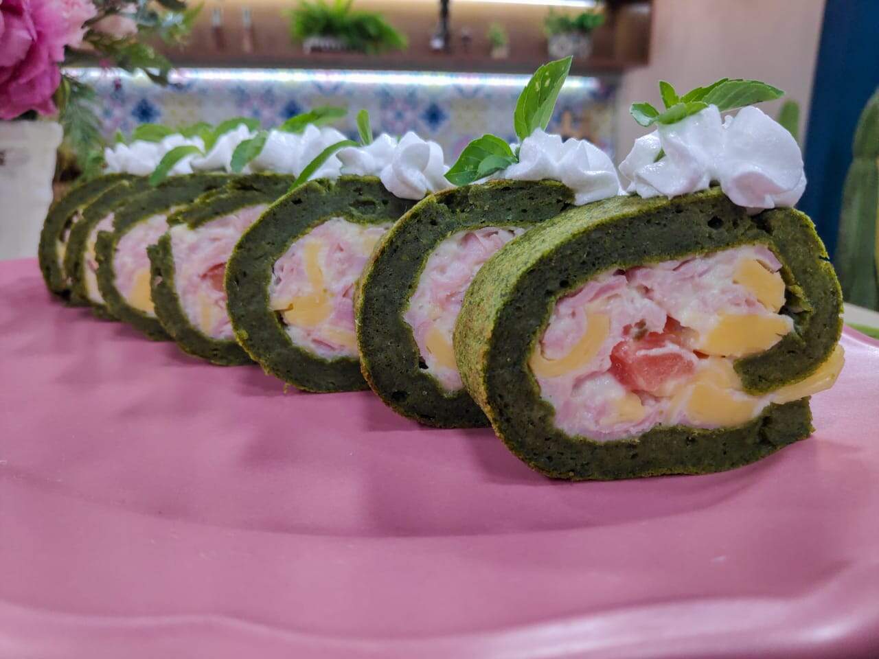 5. Desenformar em cima de um pano limpo, espalhar o recheio na massa e enrolar como rocambole com a ajuda do pano.