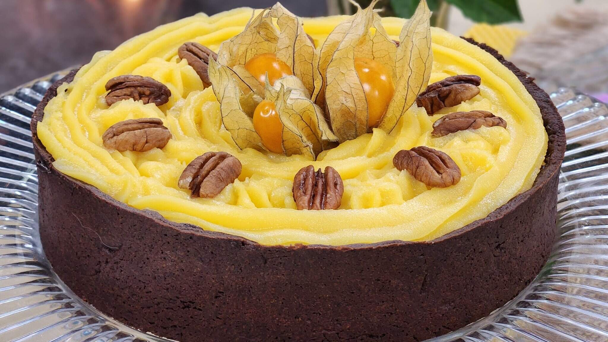 Na massa da torta já assada, espalhe o brigadeiro em temperatura ambiente e coloque a baba de moça. Decore com nozes inteiras ou picadas e se preferir coloque Physalis, pois harmoniza perfeitamente e deixa sua torta mais bonita com o tom de amarelo da baba de moça.