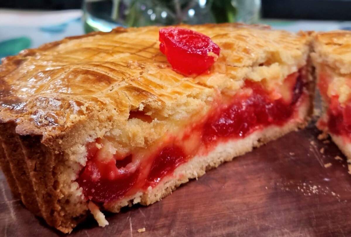 5. Rechear com o creme de confeiteiro e fazer uma camada de cerejas.