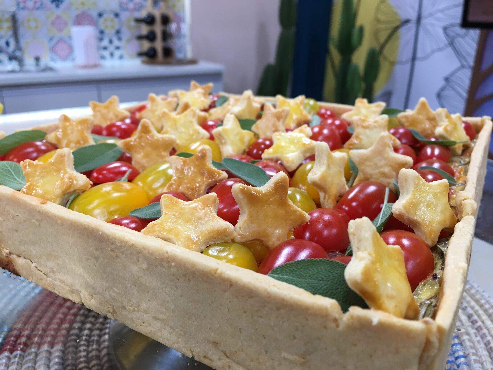 Coloque o creme em cima da base assada, espalhe tomate cereja e o alecrim.