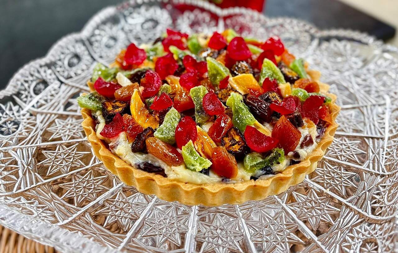 5. Espere amornar e espalhe bem o creme de confeiteiro sobre a torta. Decore contornando a torta com fatias bem finas de maçã, completando bem. Coloque a manga fatiada no centro, as uvas, fatias de laranjas e framboesas a gosto.