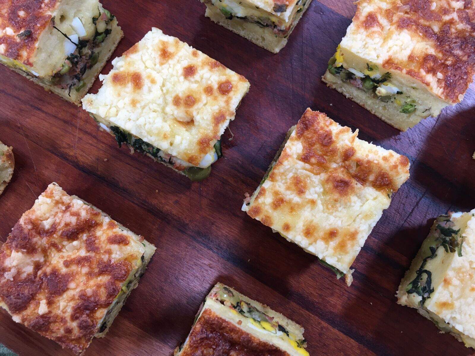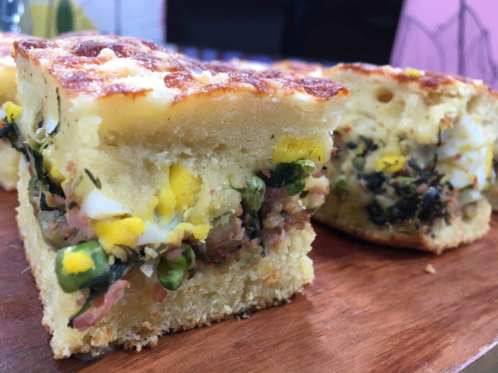 Despeje a massa na tigela do recheio, misture bem, coloque o fermento e o queijo muçarela. Misture delicadamente.