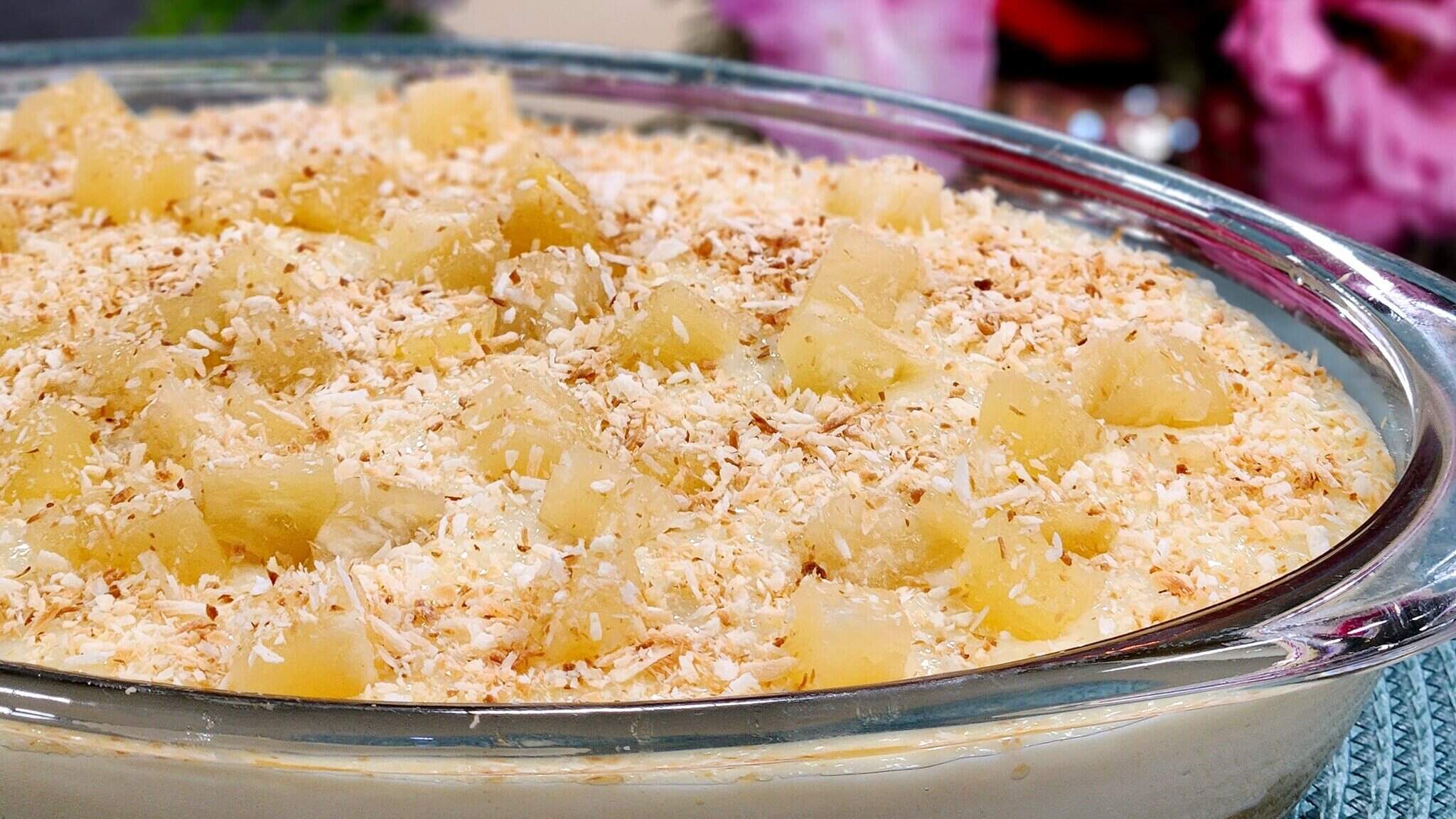 Após gelar a travessa, coloque as bolachas umedecidas sobre o abacaxi, e cubra com o creme, leve para geladeira. Finalize com abacaxi picado e deixe gelar.