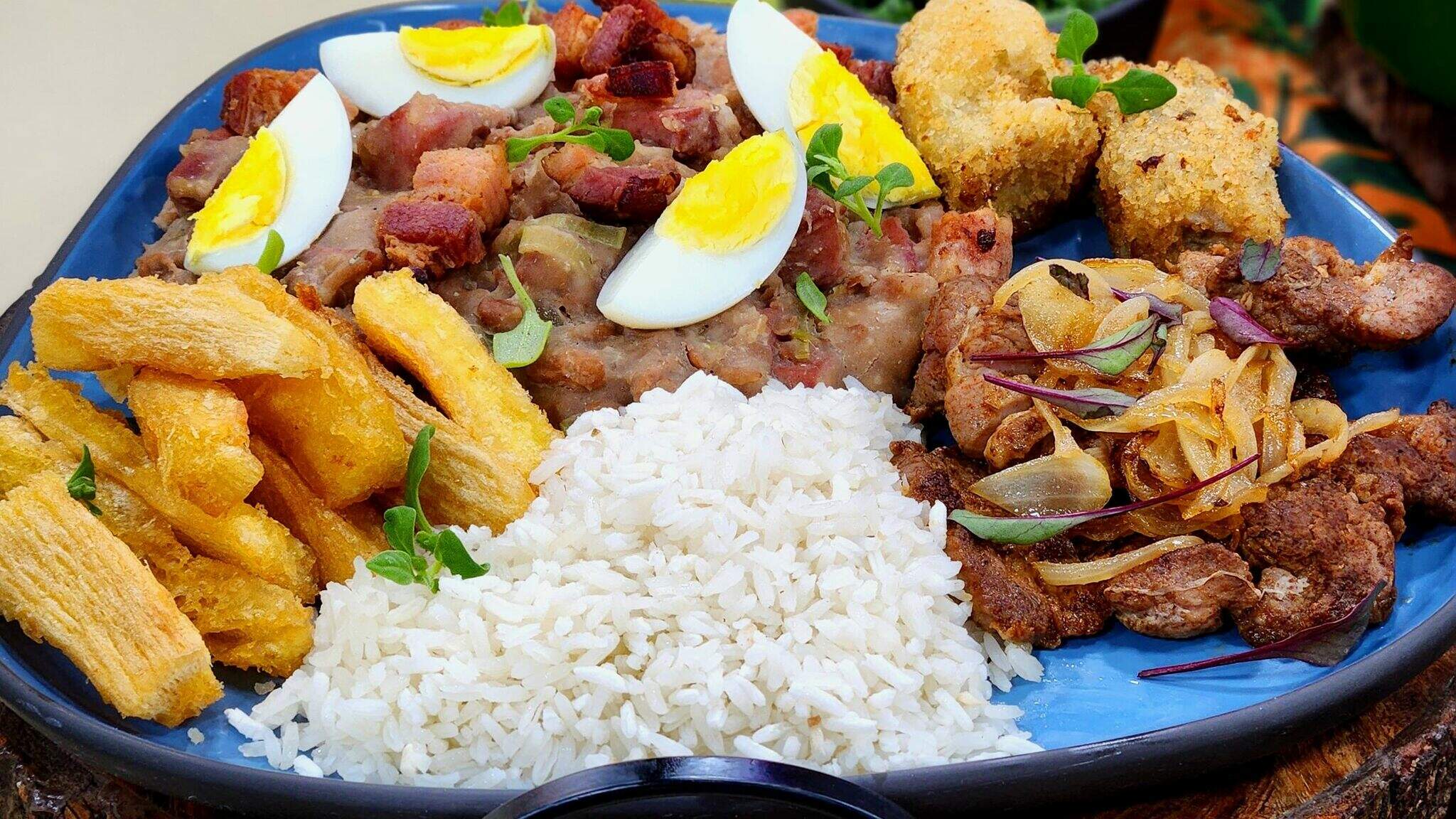 Cozinhe o feijão na panela de pressão até ficar bem molinho. Em uma panela coloque um pouco de azeite, a calabresa, o bacon, doure o alho, a cebolinha branca, o alho poró e a cebola. Coloque o feijão com um pouco de caldo, ajuste o sal e a pimenta, adicione a farinha e mexa bem. Finalize com cebolinha. Tempere a copa lombo com sal, pimenta e páprica, coloque um pouco de manteiga na frigideira e deixe dourar, retire e coloque cebolas em fatias.