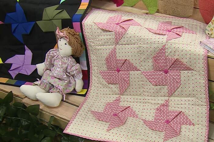 Já artesã Renata Avian mostra o passo a passo de uma caprichosa manta catavento com dobradura em técnica patchwork.