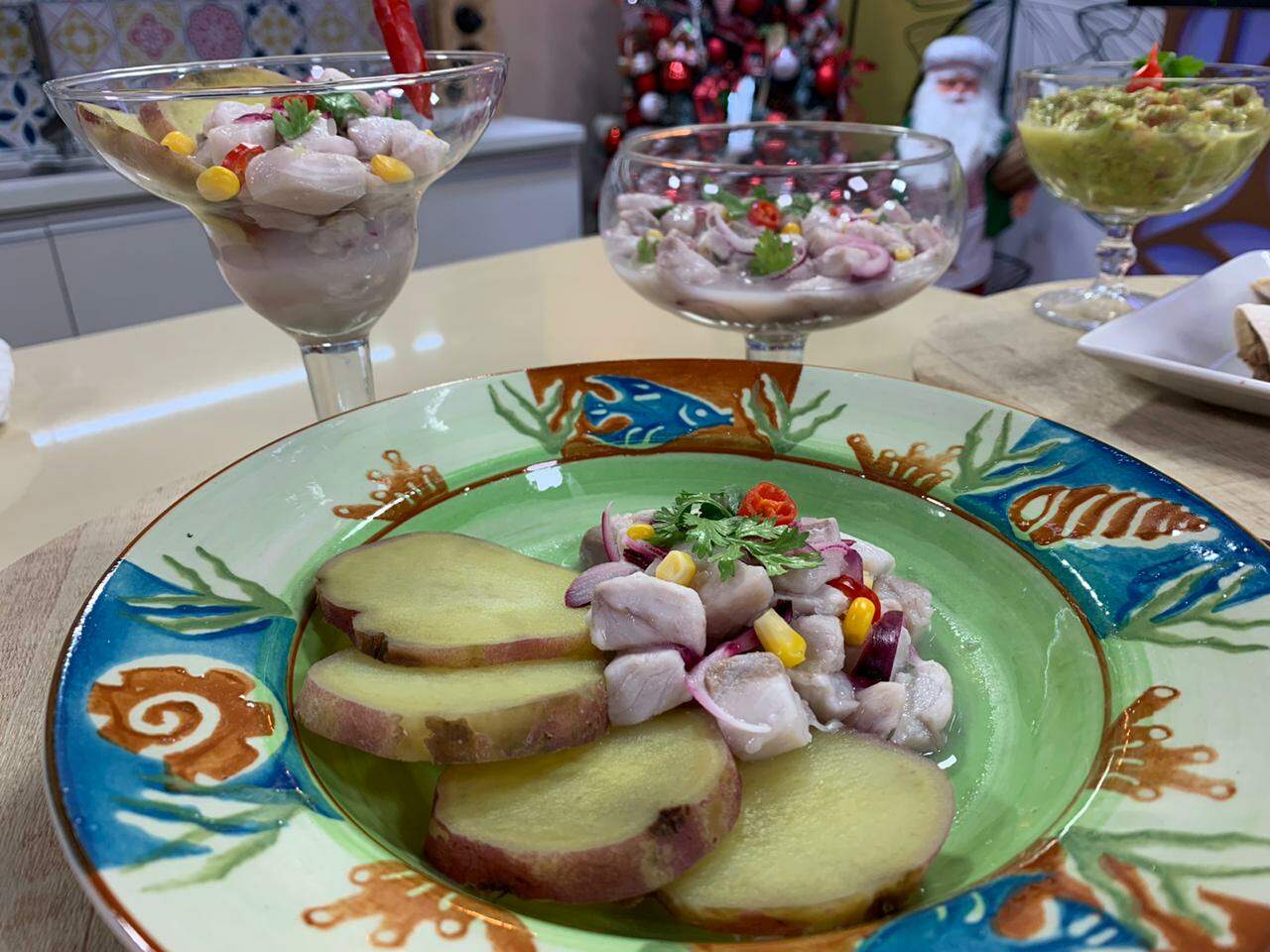 • Corte a cebola em fatias bem finas (julienne). Reserve. Corte o peixe em cubos de aproximadamente 2 centímetros e coloque-os em uma tigela grande. Adicione o sal e a pimenta e misture bem. Depois junte o gelo e o suco de limão para começar o processo de cocção. Acrescente a cebola e o coentro e mexa continuamente por quatro minutos. Prove e adicione um pouco de água, se necessário, para equilibrar a acidez. Por último, acerte o sal. Sirva com os bastões de batata-doce e as rodelas de milho.